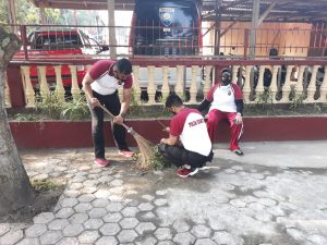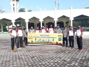 Aksi giat Bhakti sosial Polres Labuhan Batu di Masjid Bhayangkara Al-Iman dan Masjid Besar Fatmah Hasanah berupa membersihkan perkarangan masjid.