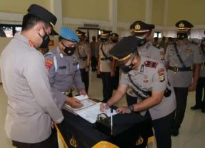 Digedung Promoter Polrestro Bekasi di Jalan Kihajar Dewantara No 1 Simpangan Cikarang Utara dilaksanakan serah terima Pejabat Utama (PJU) dipimpin langsung oleh Kapolres Metro Bekasi Kombes Pol Hendra Gunawan, S.I.K., M.Si, Selasa (22/06/2021)