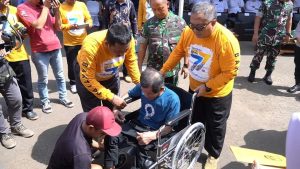 Dalam acara tersebut secara simbolis dilakukan penyerahan bantuan sembako sebanyak 71 paket kepada yatim dan jompo serta pemberian empat kursi roda.(e_y4ni3)