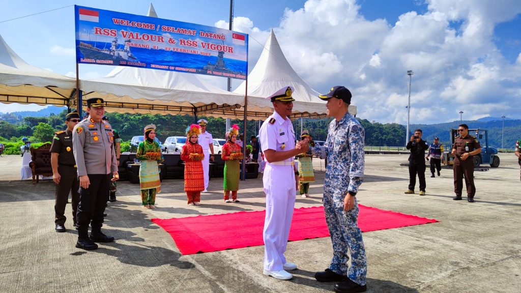 SABANG,pelitarakyat.co.id – Komandan Lanal Sabang Kolonel Laut (P) Ali Setiandy, M.Tr (Han)., M.M., bersama FKPD Kota Sabang menyambut Kedatangan 2 (dua) Kapal Perang Singapura RSS Valour (89) dan RSS Vigour (92) di Sabang dalam rangka Port Call, bertempat di Pelabuhan CT-3 Sabang, Selasa (21/02/2023).