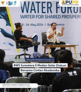 MEDAN,pelitarakyat.co.id – Menjelang perhelatan World Water Forum ke-10 di Bali pada Mei 2024, BWS Sumatera II Medan menyelenggarakan diskusi bersama Civitas Akademika Teknik Sipil Universitas Sumatera Utara (USU) dan Universitas Muhammadiyah Sumatera Utara (UMSU) di Aula Fakultas Teknik Sipil USU, Rabu (13/12/2023).