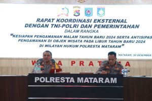 Mataram,pelitarakyat.co.id, Polresta Mataram Polda NTB menggelar rapat koordinasi eksternal TNI-Polri dan Pemerintah dalam rangka kesiapan pengamanan Malam Tahun Baru 2024 di Gedung Wira Pratama Polresta Mataram. Sabtu, (30/12/2024)