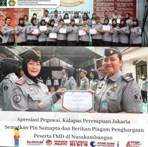 JAKARTA,pelitarakyat.co.id – Ade Agustina, Kepala Lapas Perempuan Jakarta menggelar apel pagi pegawai yang dirangkaikan dengan acara penyematan Pin Samapta dan Pemberian Piagam Penghargaan Pegawai Peserta FMD Peningkatan Kapasitas Penyelenggaraan Pemasyarakatan di Nusakambangan, Senin (18/03/2024).