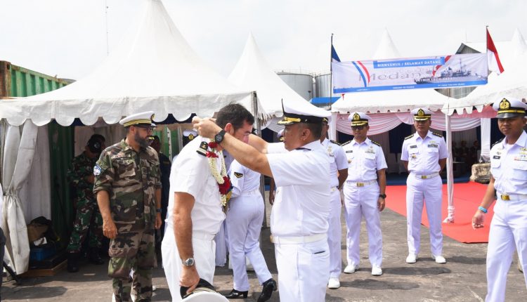 Danlantamal I Sambut Kapal Perang FNS Vendemiare F 734 di Dermaga Pelindo Belawan