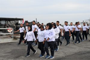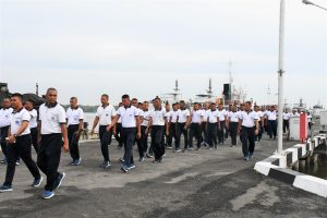 Selesai pengarahan dilanjutkan olahraga bersama dengan jalan santai keliling Mako Lantamal I yang diikuti seluruh personel I Lantamal I, dan prajurit Yonmarhanlan I.