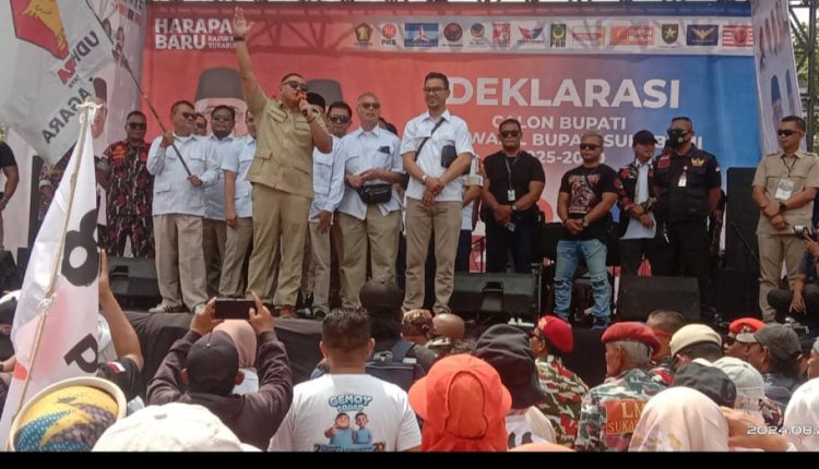 SUKABUMI,pelitarakyat.co.id – Pasangan calon Bupati Sukabumi Iyos Somantri dan Zainul yang diusung oleh 4 partai besar di kabupaten Sukabumi yaitu Gerindra, PKS, Demokrat, PDI- P serta 9 partai non parlemen, resmi mendeklarasikan dukungan di lapangan Sekarwangi Cibadak, Kamis (29/08/2024)