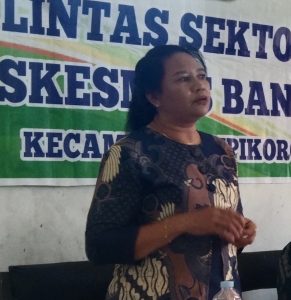 Sambutan Kepala Puskesmas Banasu,Hajriah,A.Md.Keb memaparkan kondisi dan kegiatan dari Puskesmas Banasu,dimana jumlah ibu hamilnya 33 persen, yang lain-lain berlaku lagi 88 persen, pelayanan balita 100 persen, usia sekolah 1 persen,usia produktif 25 persen,hipertensi atau darah tinggi 31 persen, penyakit gula 12 persen dan ODGJ 5 orang.
