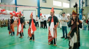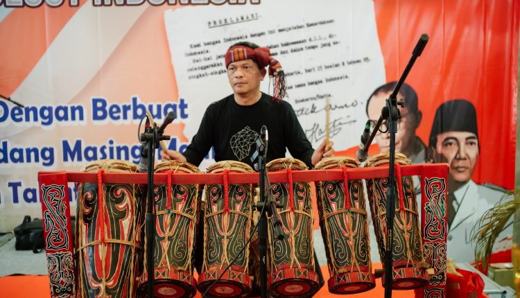 Richard Marsahala Sitohang,SH saat memainkan alat musik Taganing mengiringi tari kreasi tradisional pada acara Semarak Gebyar Kemerdekaan RI ke-80 tahun ini di PT VS Technology Indonesia