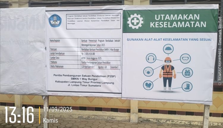 Lebih lanjut Arif menjelaskan, pelaksanaan revitalisasi SMKN 1 Way Bungur sudah dimulai sejak awal Agustus dengan masa kerja 120 hari yang direncanakan akan berakhir pada Desember 2025.